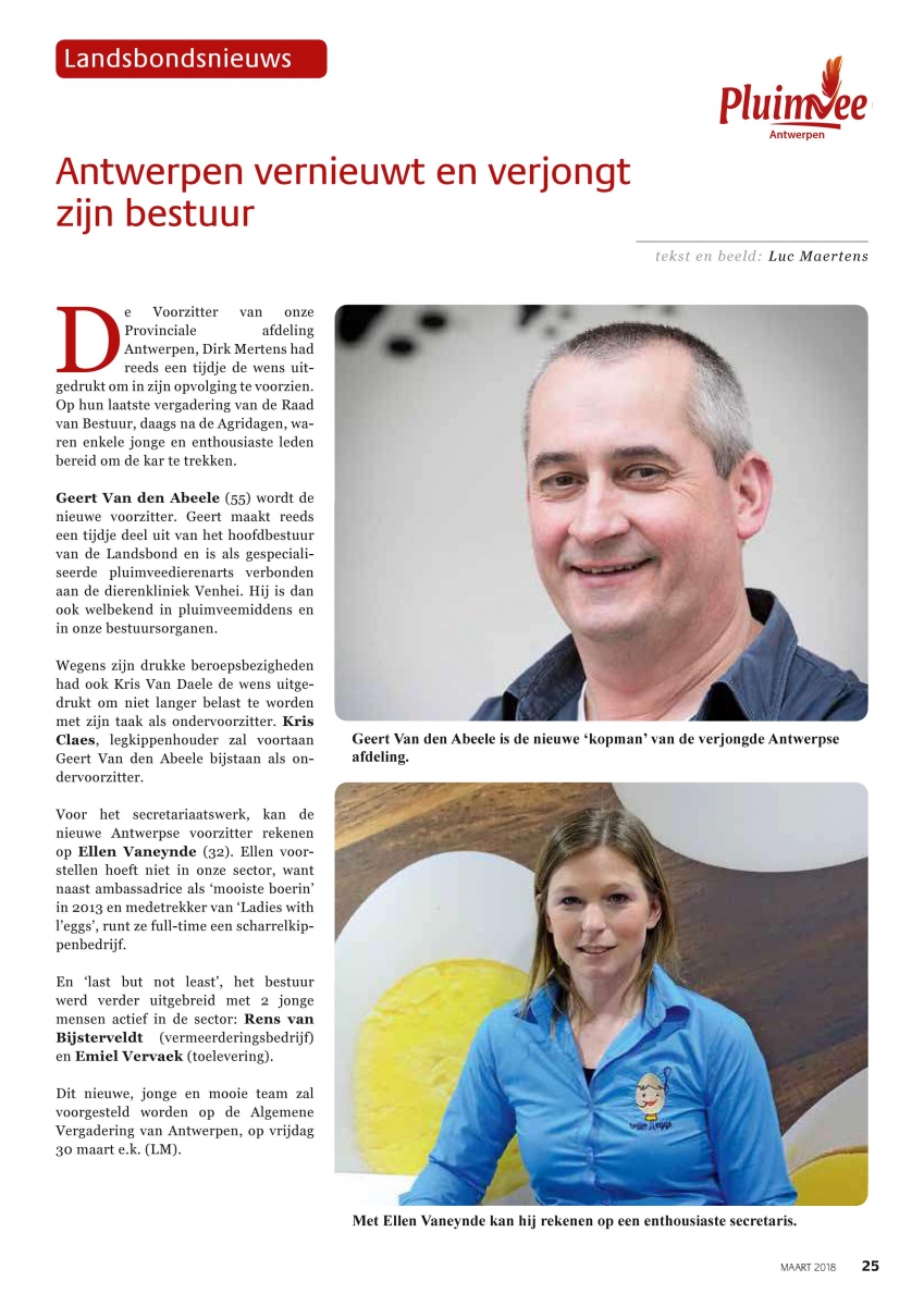 Dirk Mertens, gedurende een tiental jaar de Antwerpse voorzitter, gaf reeds een tijdje geleden aan de fakkel te willen doorgeven. Pluimveedierenarts Geert Van den Abeele nam deze enthousiast aan. Door zijn drukke beroepsbezigheden was het voor ondervoorzitter Kris Van Daele niet meer mogelijk om het Antwerpse ondervoorzitterschap op zich te nemen. Deze positie wordt vanaf nu bekleed door Kris Claes. En ook de secretarissjerp werd overgedragen van Sofie Mertens naar Ellen Vaneynde. Verder nam het bestuur ook afscheid van Hans De Brouwer die geen actief pluimveehouder meer is, maar werd het bestuur wel uitgebreid met 2 nieuwe jonge krachten Rens Van Bijsterveldt en Emiel Vervaeck.